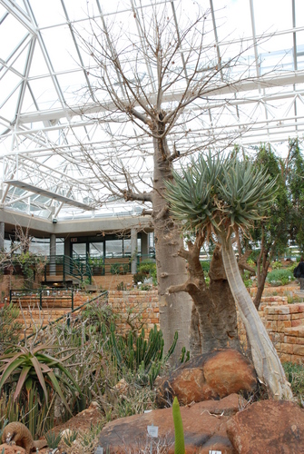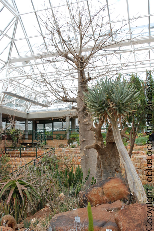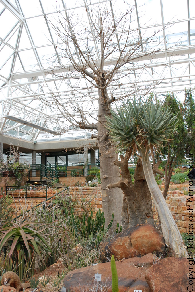 I ett växthus nära entrén till Kirstenbosch botaniska trädgård växte ett Baobab-träd (apbrödsträd). Det har en lite lustig form för kronan ser ut som ett rotsystem. |
